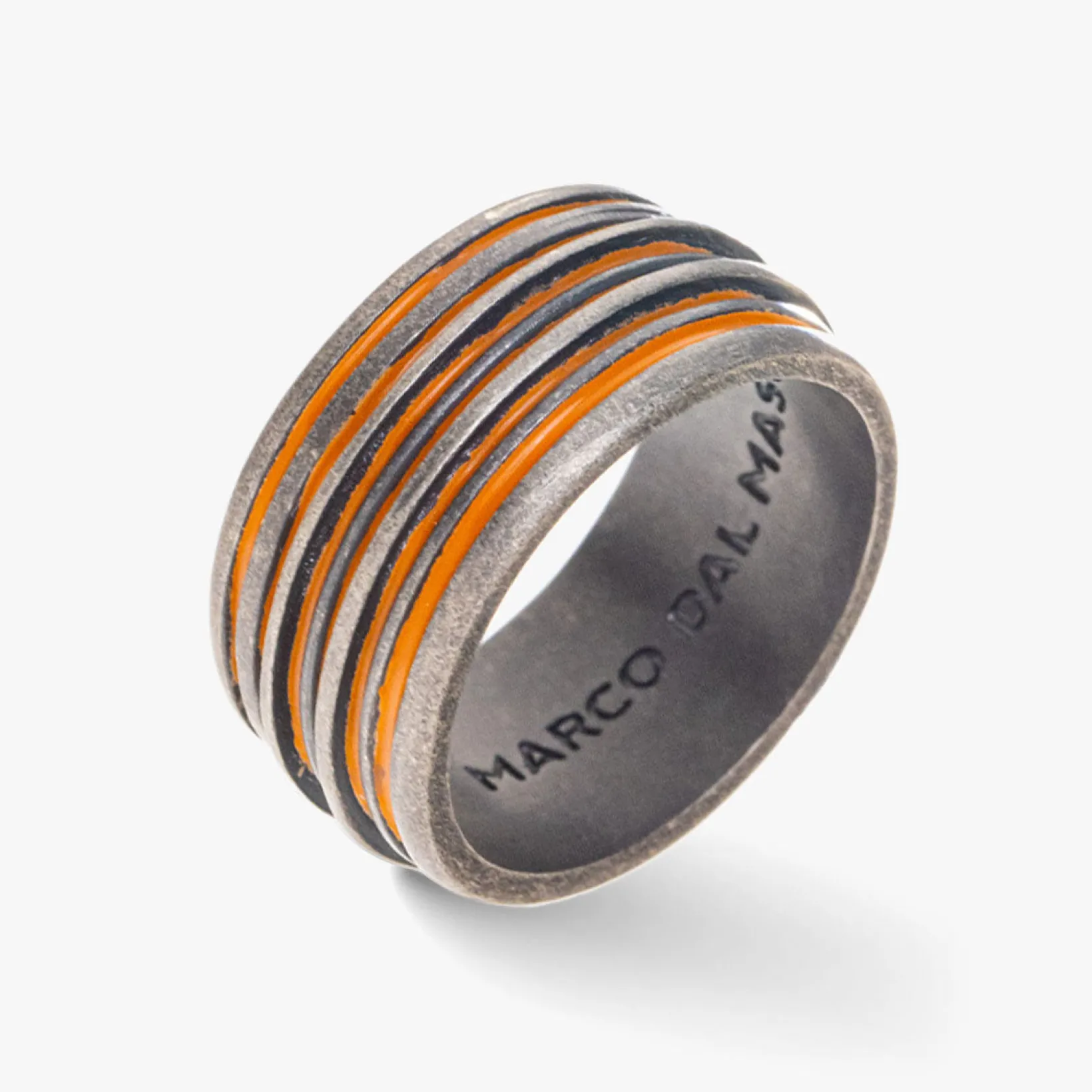 Acies Oxidized Silver Band with Tea Orange Enamel: a contemporary accent for a bold look. Crafted from oxidized silver, this band features captivating tea-orange enamel detailing, adding warmth and sophistication to any ensemble.
